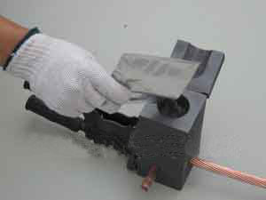 倒入焊粉,將引火粉均勻散布焊粉表面并留少許在模口位置。蓋上模蓋。